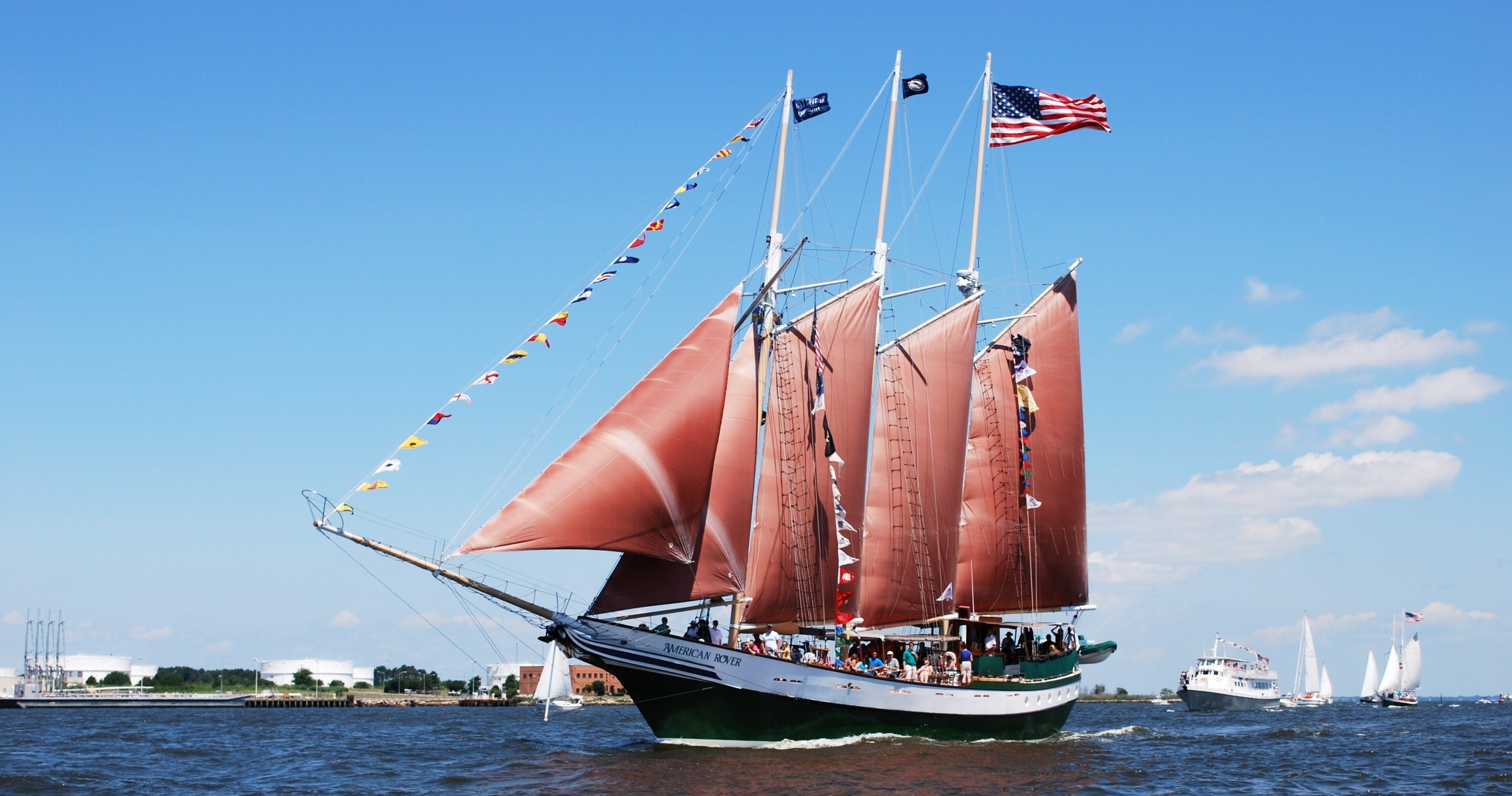 As you cruise the Elizabeth River aboard Norfolk’s iconic three-masted schooner the Captain will provide an in depth tour of all the visiting Tall Ships lining the Portsmouth and Norfolk waterfronts. With ample open deck space and shaded seating, the American Rover offers a perfect way to enjoy the celebration. In our climate controlled below deck area we have restrooms as well as a fully stocked ship’s store and bar with snacks, refreshments and souvenirs available for sale.